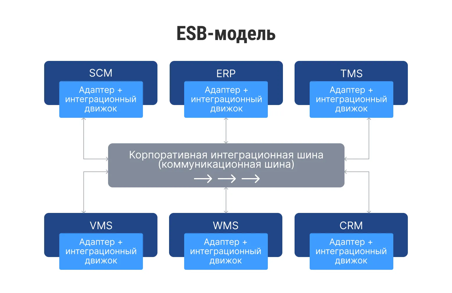 Архитектура ESB предполагает создание отдельной специализированной подсистемы — корпоративной сервисной шины, которая выступает в роли общего интеграционного слоя и соединяет между собой остальные подсистемы.