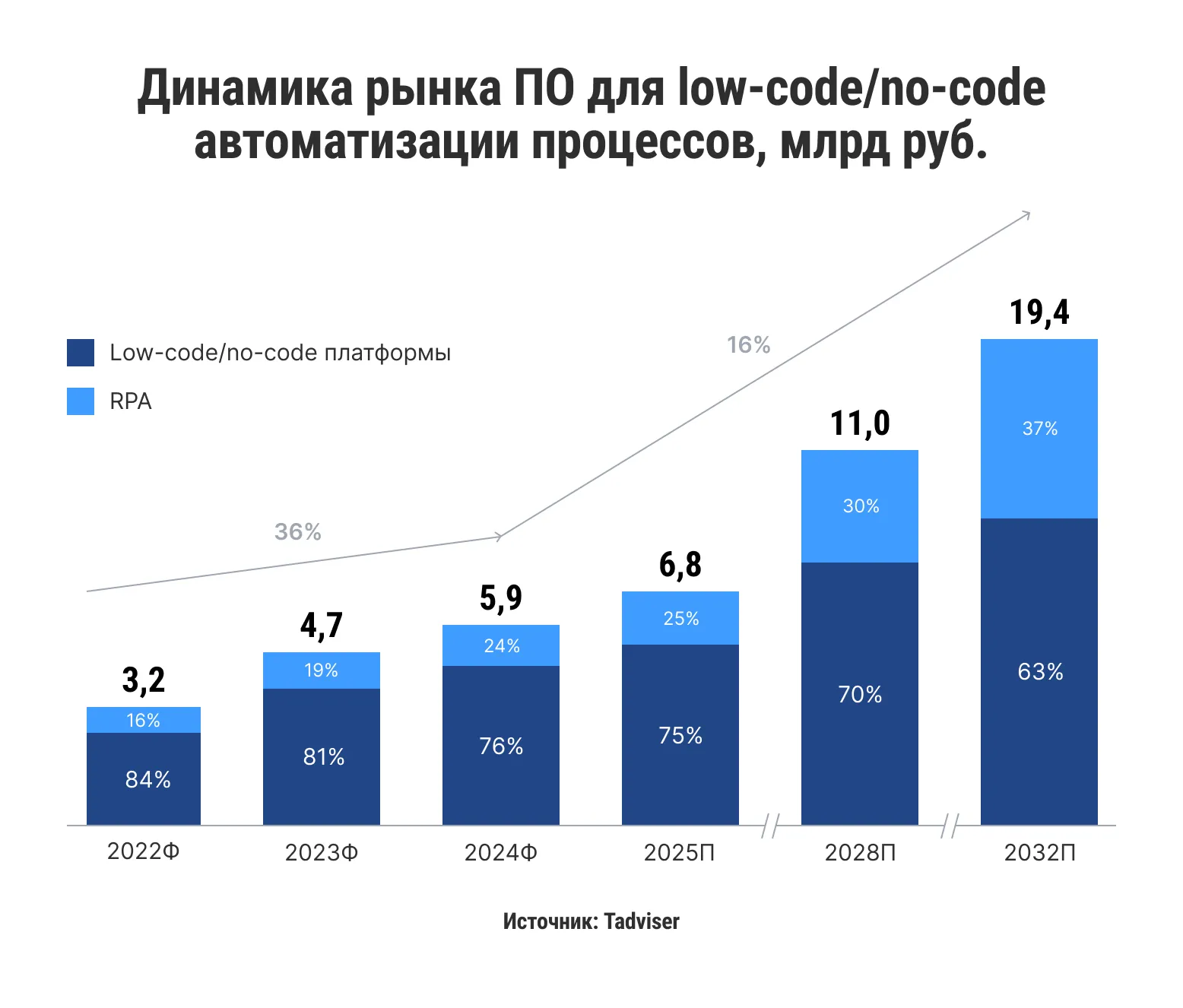 Такое развитие событий пробудило активный интерес к low code/no code-разработке программного обеспечения. Согласно отчету консалтинговой компании Б1, в 2024 году затраты на российском рынке ПО для low-code/no-code-автоматизации процессов достигли 5,9 млрд рублей. Это примерно на 25% больше по сравнению с предыдущим годом, когда расходы оценивались в 4,7 млрд рублей.