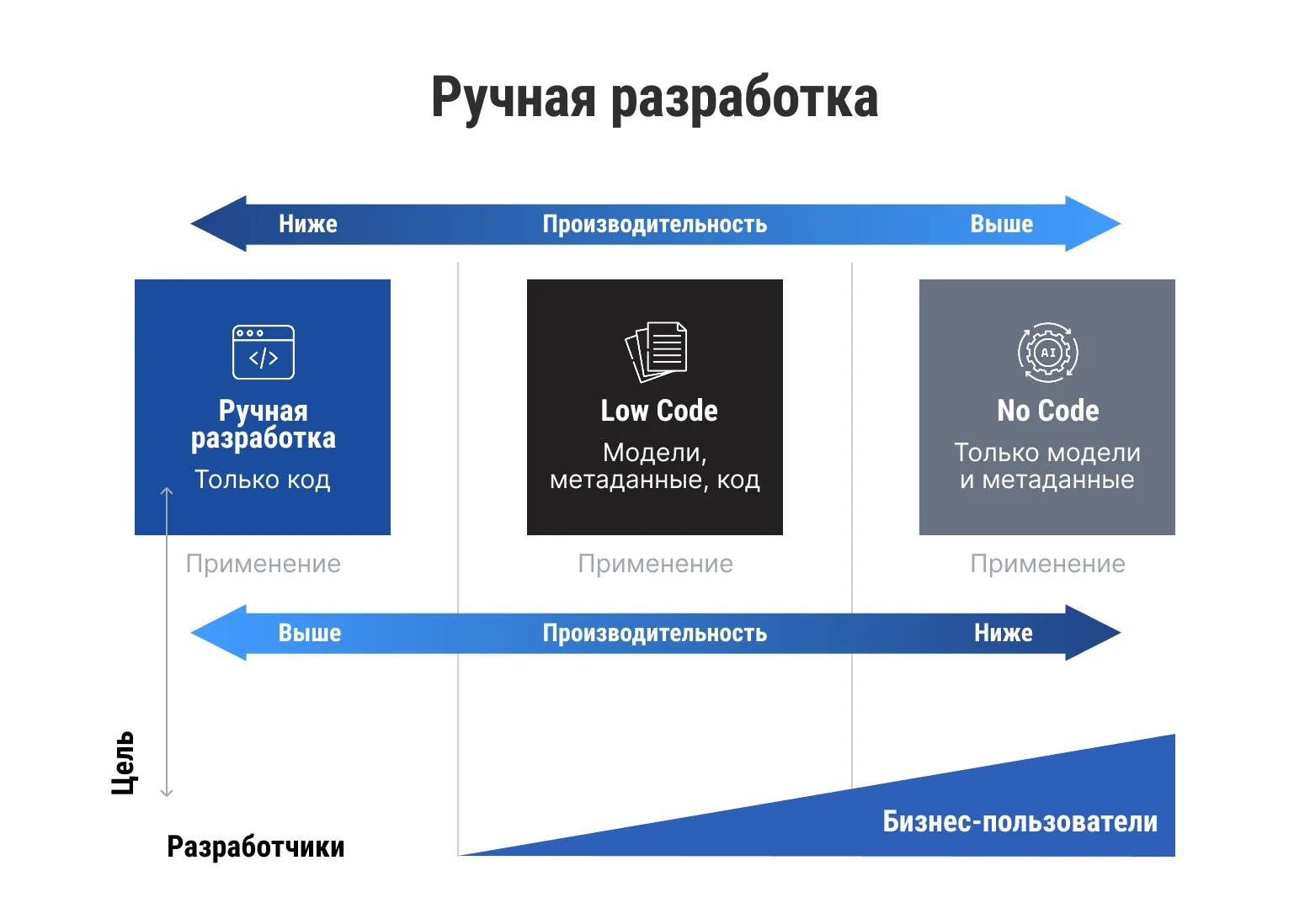 Не совсем так. Ручная (традиционная) разработка по-прежнему занимает важное место. Она дает гораздо больше гибкости и возможностей для масштабирования, поскольку каждую строку кода можно адаптировать под конкретные требования и реализовать любую задуманную функциональность.
