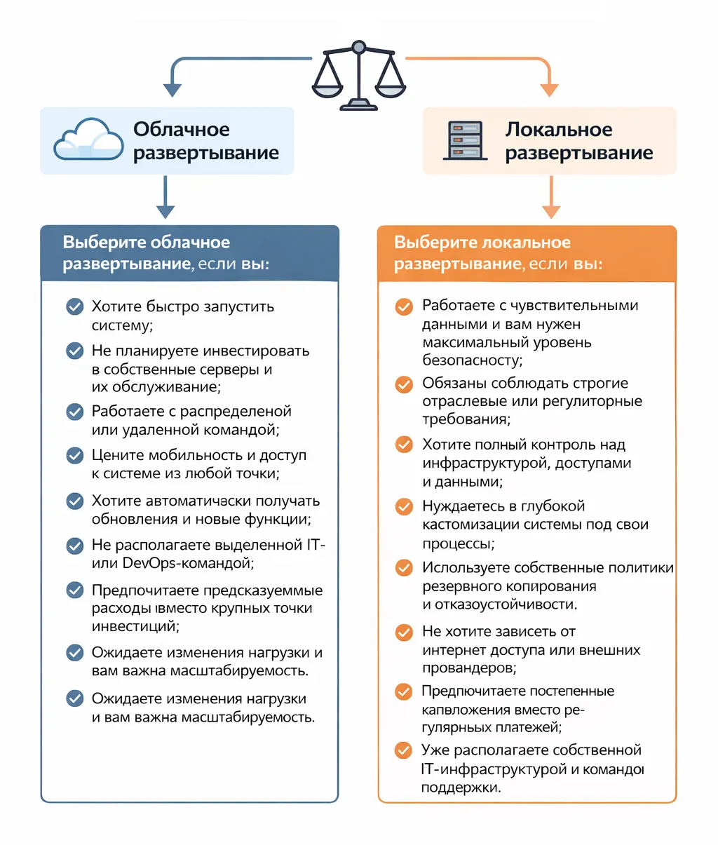 Облачные решения позволяют быстро развернуть систему без сложной подготовки инфраструктуры. Команда может начать работу практически сразу. |