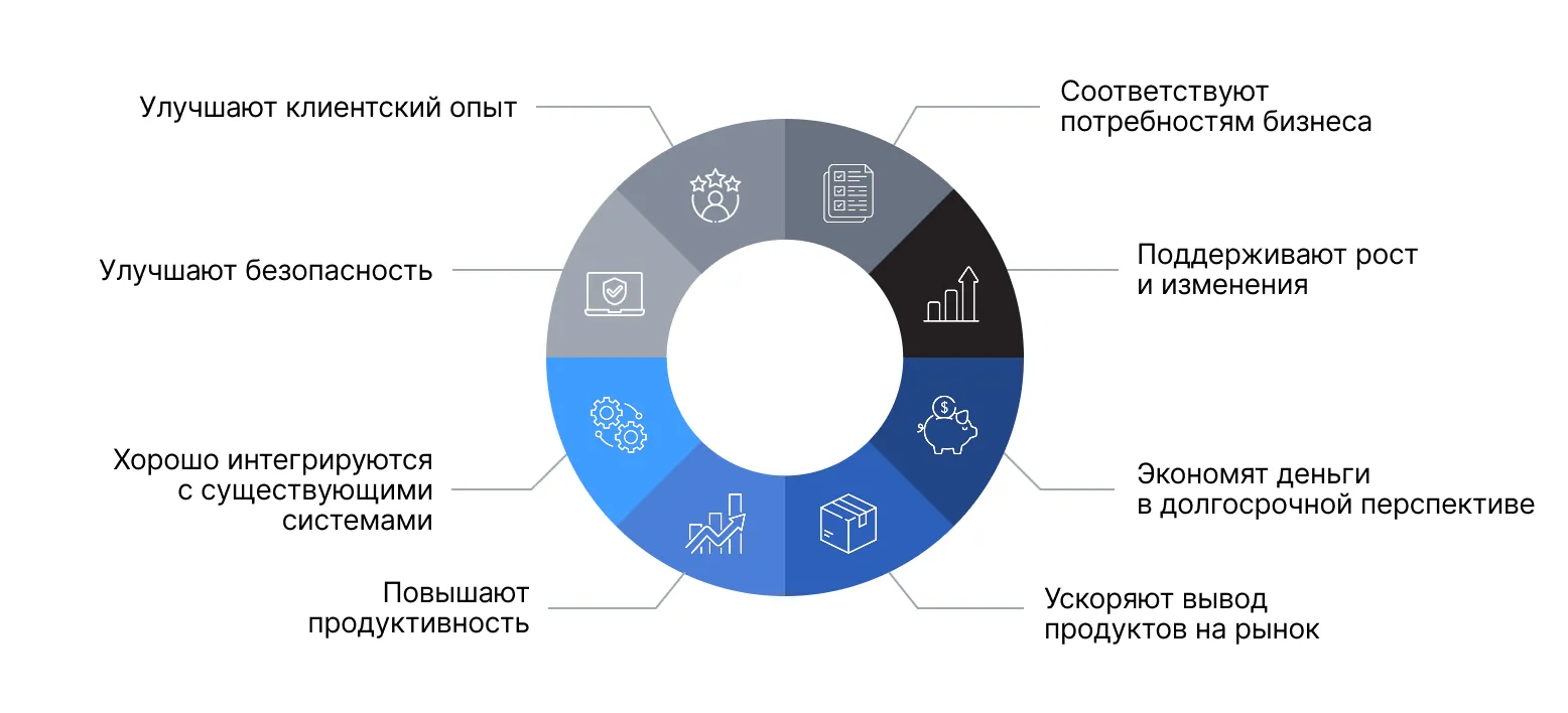Мы не сводим работу к простому написанию кода и не ограничиваемся набором стандартных практик. Наша роль шире — мы проектируем цифровую архитектуру, которая отражает стратегию компании, ее отраслевые особенности и уровень технологической зрелости. Это означает, что каждое решение мы рассматриваем не как отдельный проект, а как часть системы, которая должна развиваться вместе с бизнесом.
